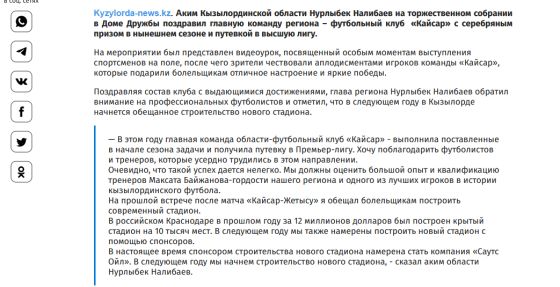 Кстати, три года назад, в ноябре 2022-го, по окончании футбольного сезона аким Кызылординской области Нурлыбек Налибаев обещал построить новый стадион как раз таки на частные средства – их, по его словам, должна была выделить нефтегазовая компания “Саутс Ойл”. Тогда же он привел в качестве примера арену вместимостью 10 тысяч зрителей (на самом деле 7,5 тысячи – прим. авт.), которую за 12 миллионов долларов построил годом ранее в Краснодаре бизнесмен и владелец тамошнего футбольного клуба Сергей Галицкий.