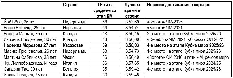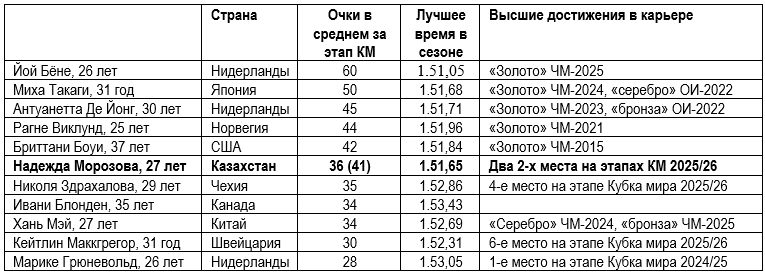 Начнем с 27-летней Надежды Морозовой, которая родилась и выросла в Астане. В мировую элиту она пробилась еще в предыдущем олимпийском цикле. Но тогда ей не удалось подойти к главным стартам четырехлетия в оптимальном физическом и психологическом состояния. А затем наступил довольно длительный спад, причем результаты Надежды на коронной дистанции 1500 метров стали даже хуже, чем на менее профильной для нее «тысяче». Как следствие, она выбыла из топ-20, поэтому на первом в нынешнем зимнем сезоне 2025/2026 этапе Кубка мира, с которого начался отбор на Олимпиаду, Морозовой пришлось бежать «полуторку» в более слабой по составу участниц группе «В».