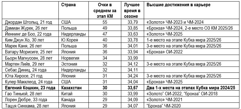 Лидеры общего зачета Кубка мира сезона 2025/26 в мужском беге на 500 метров