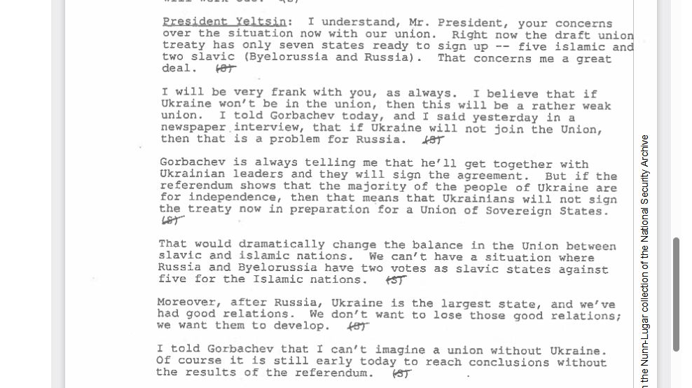 За день до этого события Михаил Горбачев и Борис Ельцин разговаривали по телефону с президентом США Джорджем Бушем-старшим (содержание бесед было рассекречено спустя почти три десятилетия). В частности, Ельцин поделился с американским лидером своей озабоченностью: «… Если референдум покажет, что большинство народа Украины за независимость, то это значит, что украинцы не подпишут договор, который сейчас готовят для Союза Суверенных Государств. Это приведет к драматическому изменению баланса в Союзе между славянскими и мусульманскими нациями. Мы не можем допустить ситуации, в которой два славянских государства, Россия и Белоруссия, имеют два голоса против пяти голосов у мусульманских наций» (имелись в виду республики Центральной Азии, а что касается Азербайджана, то его власти вскоре после путча отказались от участия в работе над новым союзным договором – прим. авт.).