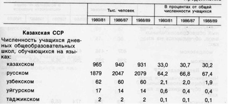 В последнее десятилетие существования СССР доля учащихся казахских классов снизилась с 33,0 до 30,2 процента, а доля обучавшихся в русских, напротив, выросла с 64,2 до 67,4 процента (были также узбекские, уйгурские, таджикские). Эта тенденция сохранялась и после декабрьских событий 1986-го, вроде бы ознаменовавших возрождение национального самосознания, и позже, когда начался распад СССР.