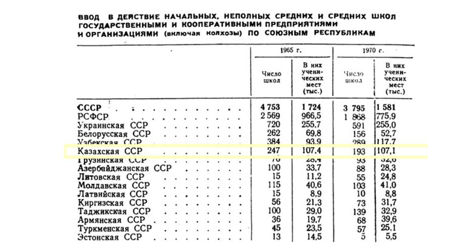 В 1960-е годы в нашей республике ежегодно сдавали в эксплуатацию порядка двухсот – двухсот пятидесяти школ, рассчитанных в сумме примерно на 100 тысяч ученических мест (см. приведенную ниже таблицу из сборника «Народное образование, наука и культура в СССР», 1971 г., стр. 388). Примерно такие же показатели были и в 1970-х. В построенных тогда зданиях и сегодня получают знания многие юные казахстанцы.